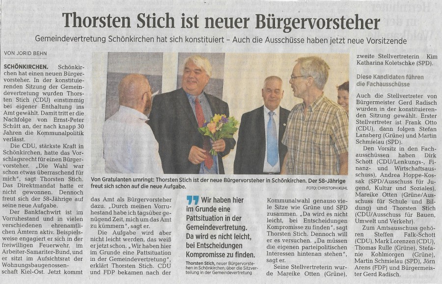 Wir konnten in dieser Legislaturperiode gemeinsam mit der CDU bürgerliche Interessen vertreten und haben mit der Fraktion für Schönkirchen weitreichende Ergebnisse erzielt. Jetzt ist es unser erklärtes Ziel, künftig als eigenständige FDP Fraktion in der Gemeindevertretung noch mehr liberales Profil zeigen zu können.